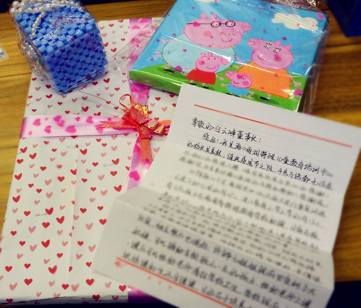 寫信的人是??谟隄櫶厥鈨和逃嘤栔行男iL吳美林,禮物則是由學校的自閉癥兒童及智力發育遲緩兒童親手制作,一同寄過來的還有一沓厚厚的照片,那是學校孩子們接受教育和康復訓練的活動掠影。