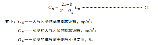 1.4 對于玻璃熔窯排氣(純氧燃燒除外),應同時對排氣中含氧量進行監測,實測排氣筒中大氣污染物排放濃度應按式(1)換算為含氧量為8%狀態下的基準排放濃度,并以此作為排放是否達標的依據。其他車間或生產設施排氣按實測濃度計算,但不得人為稀釋排放。